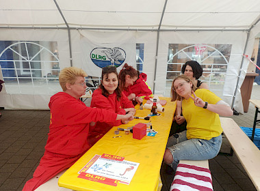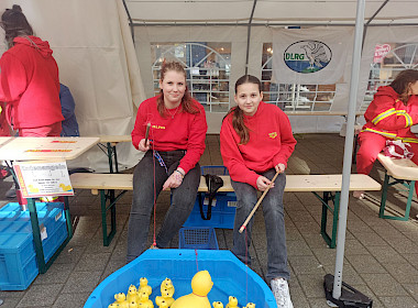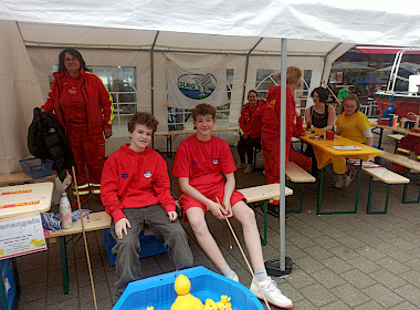 An diesem frühen Sonntagmorgen trafen wir uns bereits um 8.30 Uhr an unserem, schon bekannten Standort auf der Steinbrinkstraße in Oberhausen Sterkrade. Unsere Routine in Sachen Aufbau hilft uns bereits vor der geplanten Eröffnung einen fertig aufgestellten und dekorierten Stand zu haben. So haben wir immer noch Zeit ein kurzes gemeinsames Frühstück einzunehmen. Ab ca. 10 Uhr hieß es dann, durchgehend im Einsatz zu sein. Unser Stand war während der gesamten Zeit sehr gut besucht. Unser Entenangeln ist nach wie vor mehr als beliebt und die Warteschlange endete nie, ebenso beliebt bei den jüngeren Besuchern waren unsere Glitzertattoos mit Motiven aus der Wasserwelt. Die etwas älteren Kinder und auch einige Erwachsene konnten mit buntem Tauwerk unter Anleitung einen Schlüsselanhänger fertigen. Das ausgestellte Motorrettungsboot zog auch viele Interessierte an, hier wurde sich auch fleißig nach unserem Einsatzgebiet, der Ausstattung des Bootes nach der „Schnelligkeit“ des Bootes gefragt.